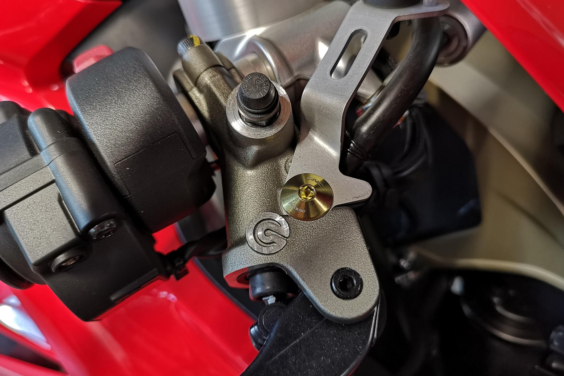 Vite in titanio ricavata dal pieno per il fissaggio della staffa serbatoio fluido freno anteriore o frizione alla pompa Brembo. L'utilizzo di titanio grado 5  permette un notevole risparmio di peso e massima protezione dalla corrosione.