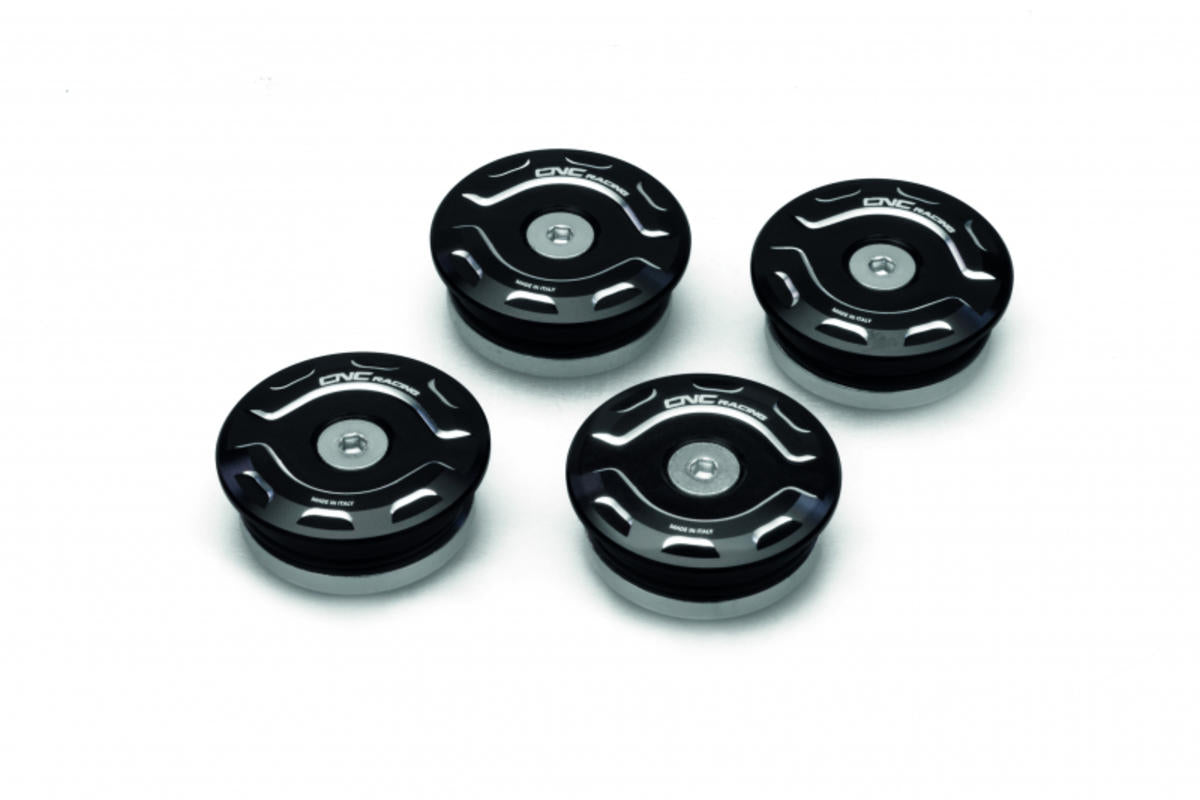 Tappi per le protezioni telaio realizzati dal pieno in lega leggera con successivo trattamento di anodizzazione superficiale.