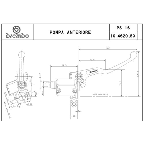 Pompa freno Brembo PS 16 nera con serbatoio, progettata per garantire una frenata potente e modulabile. Il corpo nero, abbinato alla leva silver, offre un design elegante e resistente, mentre il pistone da 16 mm assicura una risposta rapida ed efficiente. Ideale per motociclette di media e alta cilindrata, rappresenta una scelta di qualità per migliorare il sistema frenante.