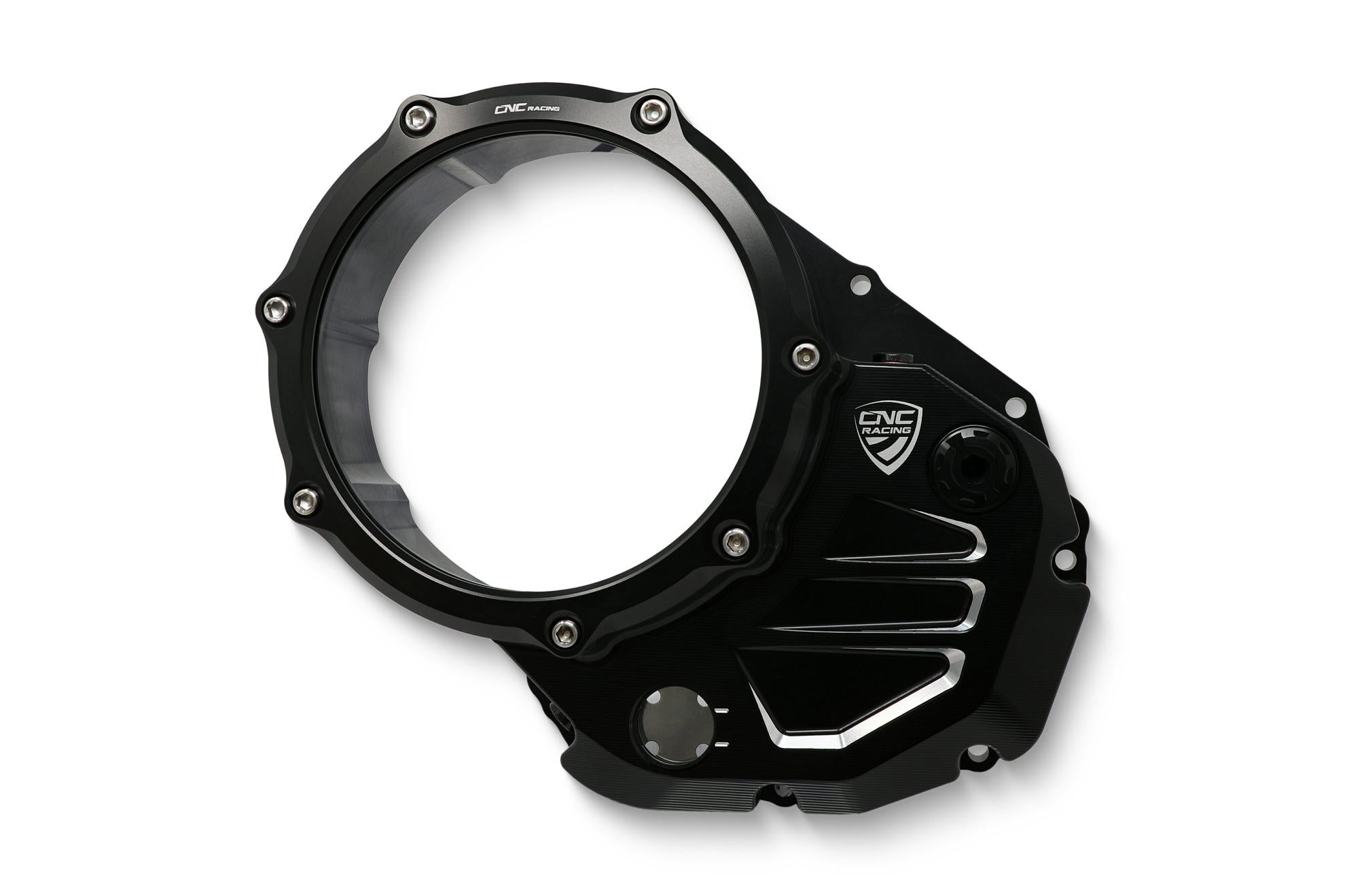 Carter trasparente per frizioni ad olio Ducati realizzato in alluminio lavorato dal pieno.