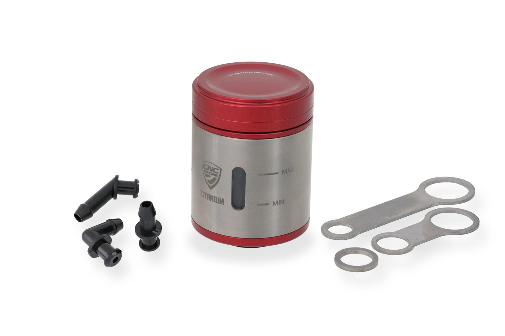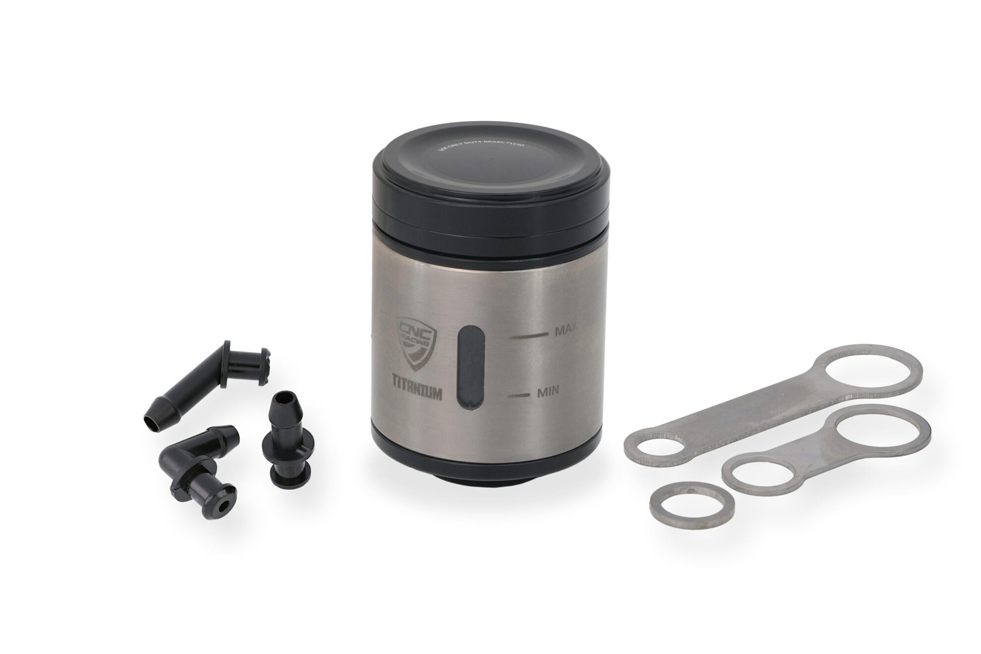 Serbatoio olio da 25 ml per pompe freno anteriore prodotto in Titanio. Il tappo è in alluminio lavorato dal pieno in lega leggera con successiva anodizzazione superficiale.